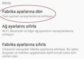 Fabrika ayarlarına sıfırla: Bu seçenek ise teleondaki tüm ayarları sıfırlar ve dökümanları siler. Bu işlemler rehber, resimler, videolar, mesajlar, uygulamalar ve uygulama verileri gibi cihaz hafızasındaki tüm verileri sileceğinden yedek almanızı öneriyoruz.