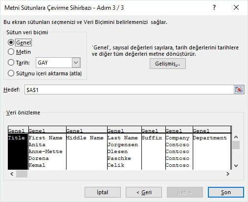 Yukarıdaki resimde Veri önizleme bölümünde göreceğiniz üzere ilk sütun seçili durumda ve Sütun veri biçimi Genel olarak işaretli. Aşağıdaki kısımdan diğer sütunları da seçerek hepsi için istediğiniz veri biçimini belirleyebilirsiniz.