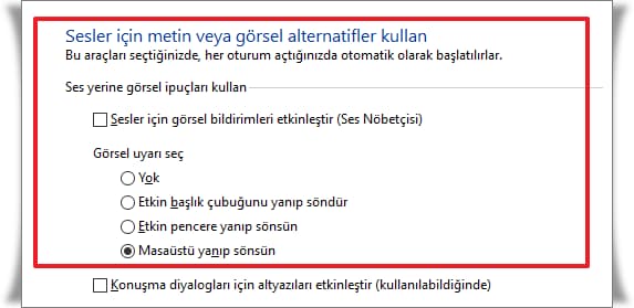 - Ses yerine görsel ipuçları kullan‘ı aktif ederek Masaüstü yanıp sönsün kısmını seçin.
