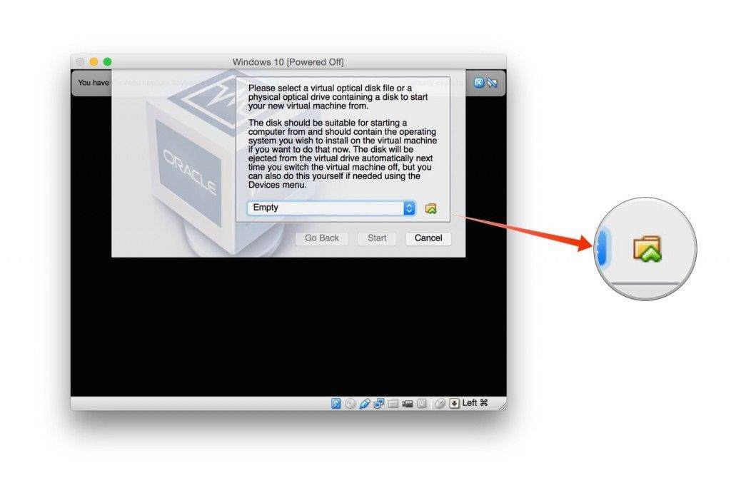Eğer sanal makineyi oluşturmayı bitirdiğinizde, aşağıdaki uyarı gelecektir, yani: “Bir sanal optik disk dosyası ya da sizin yeni sanal makine başlatmak için bir fiziksel optik diski seçin” Eğer indirdiğiniz, Windows 10 Teknik Önizleme ISO dosyasını bulmak için kullanabileceğiniz dosya tarayıcısına gitmek için klasör simgesini tıklayın.