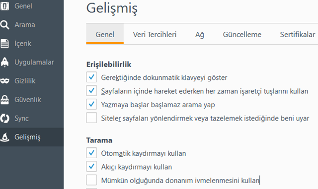 Adres çubuğuna about:preferences#advanced yazıp Enter tuşuna bastıktan sonra açılan pencerede Genel sekmesine tıklıyoruz ve Erişilebilirlik altında bulunan “Yazmaya başlar başlamaz arama yap” seçeneğini işaretliyoruz. Bu ayarı aktif etmeden önce ve sonra arama yapmayı test etmenizi, farkı görmeniz açısından tavsiye ederim.