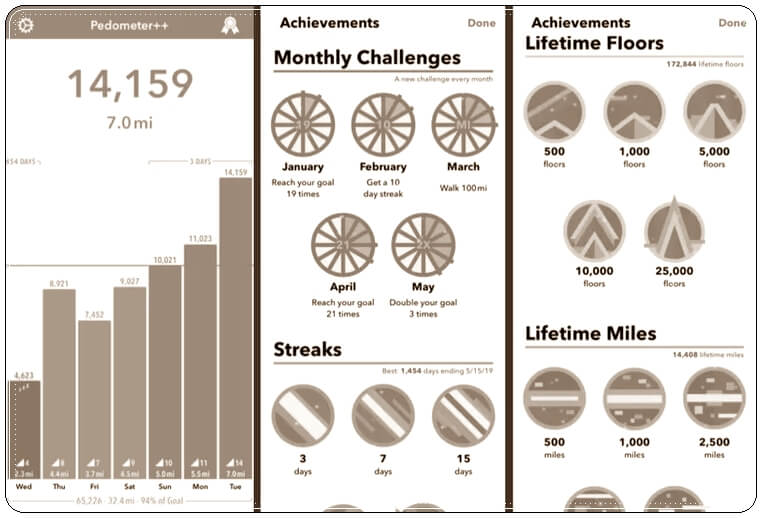 Pedometer++, basit tasarımı seven ancak adım etkinlikleri için biraz daha özelleştirme isteyenler içindir. Haftalık ilerlemenizi, her çubuğun adım hedefinize ulaşmanıza, yetersiz kalmanıza veya onu aşmanıza göre renk kodlu bir çubuk grafikte görebilirsiniz. Ücretsiz AdımSayar uygulaması ayrıca kendi hedeflerinizi belirleyebileceğiniz ve aylık mücadelelere, serilere, yaşam boyu millere ve ödüllere katılabileceğiniz bir Başarılar sekmesi içerir.