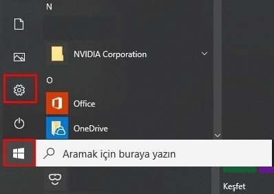 Windows 10 siyah tema etkinleştirmek için öncelikle Başlat menüsü üzerinde Ayarlar sekmesine tıklayalım.