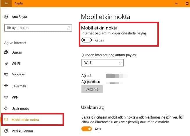 Bu alanda sol menüden “Mobil etkin nokta” seçin. ev açılan pencerede “iİnternet bağlantımı diğer cihazlarla paylaş” seçeneğini açık konuma getirin.